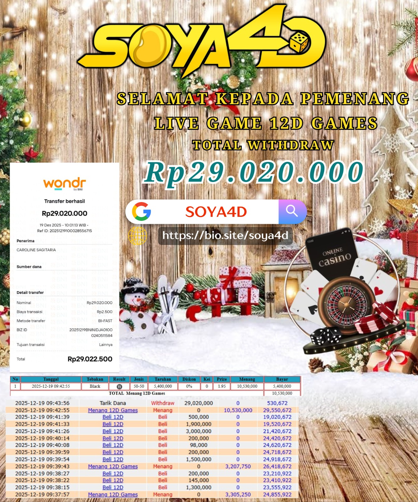 Selamat kepada Userid : Dal**** Telah berhasil mendapatkan kemenangan besar pada permainan LIVE GAME 12D GAMES . Dengan kemenangan Sebesar Rp.29.020.000.-. Setelah mengisi formulir withdraw dengan kurang waktu hanya 1 – 10 menit pihak SOYA4D sudah melakukan transfer kepada pemilik user id. Dan dana sudah masuk ke rekening id tersebut oleh pemenang. Bukti pembayaran yang kami berikan merupakan bukti pembayaran yang SAH / VALID yang langsung di dapatkan melalui tanda transfer transaksi berhasil dari Bank yang di tuju.