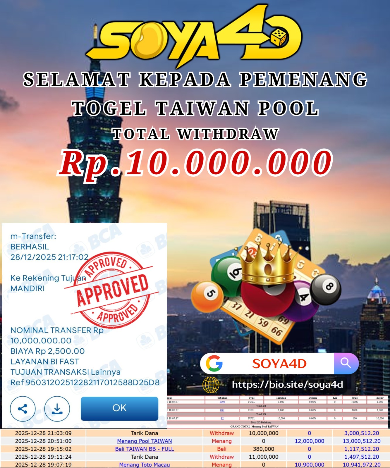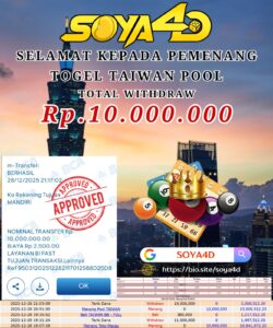 Selamat kepada Userid : Bui***** Telah berhasil mendapatkan kemenangan besar pada permainan TOGEL TAIWAN POOL . Dengan kemenangan Sebesar Rp. 10.000.000.-. Setelah mengisi formulir withdraw dengan kurang waktu hanya 1 – 10 menit pihak SOYA4D sudah melakukan transfer kepada pemilik user id. Dan dana sudah masuk ke rekening id tersebut oleh pemenang. Bukti pembayaran yang kami berikan merupakan bukti pembayaran yang SAH / VALID yang langsung di dapatkan melalui tanda transfer transaksi berhasil dari Bank yang di tuju.