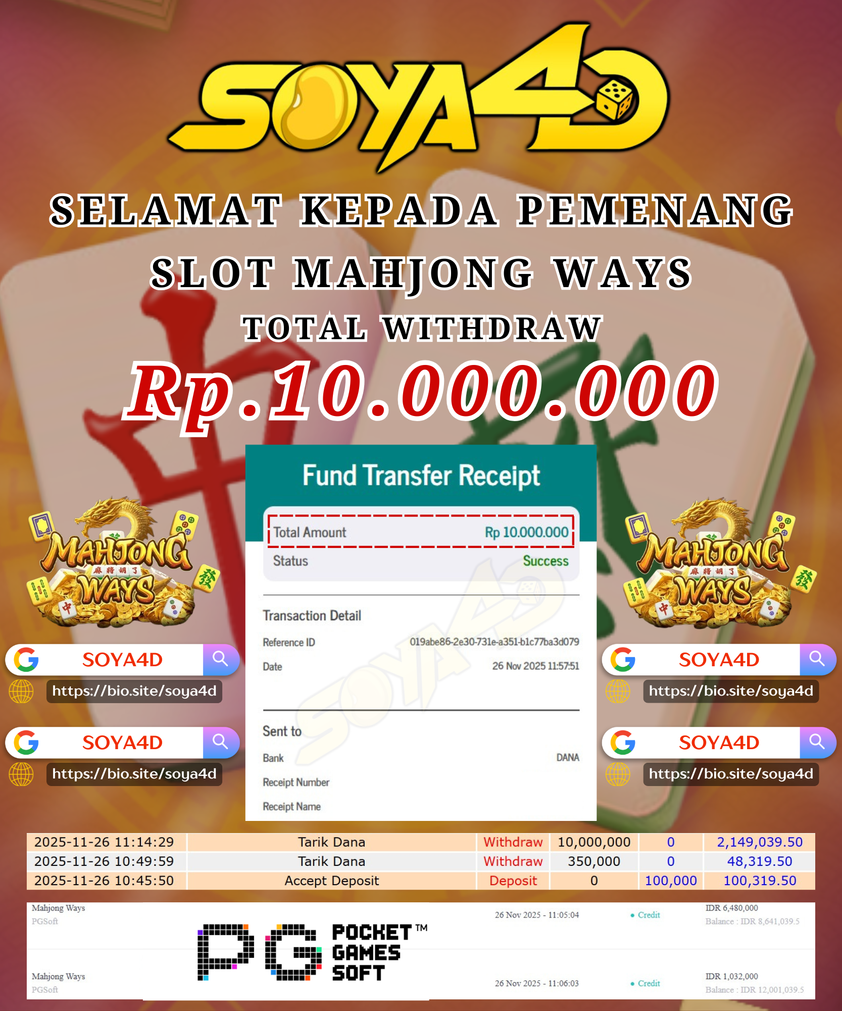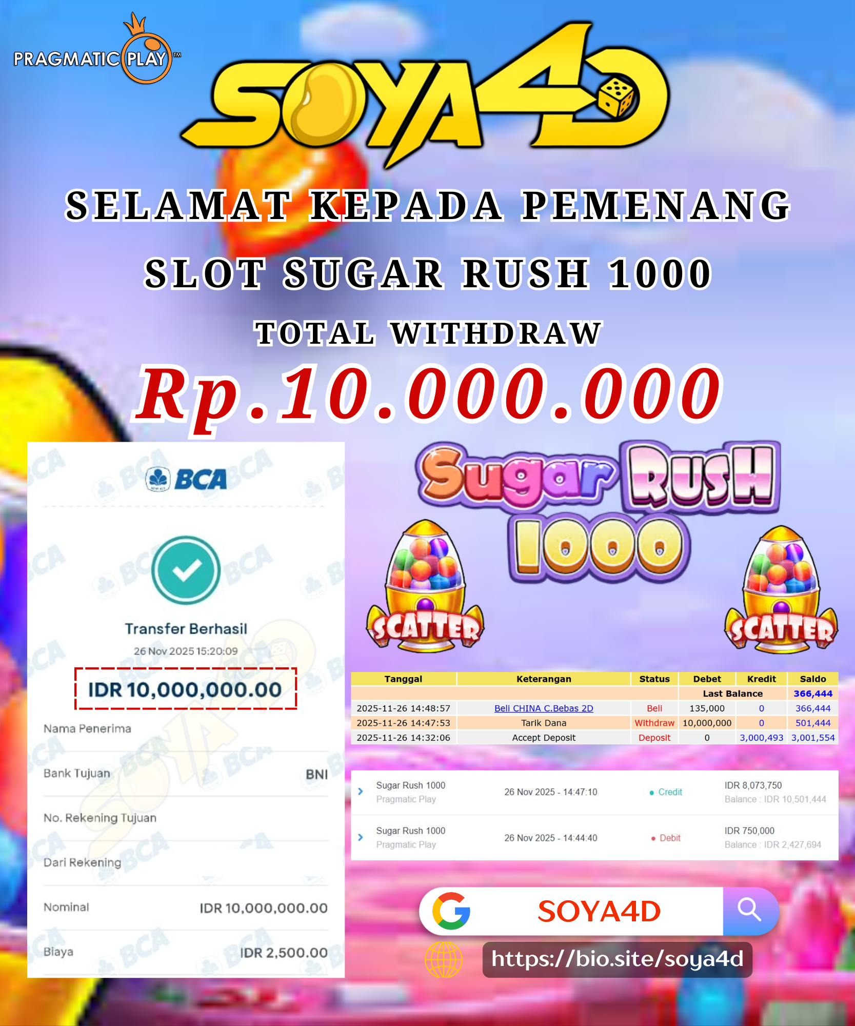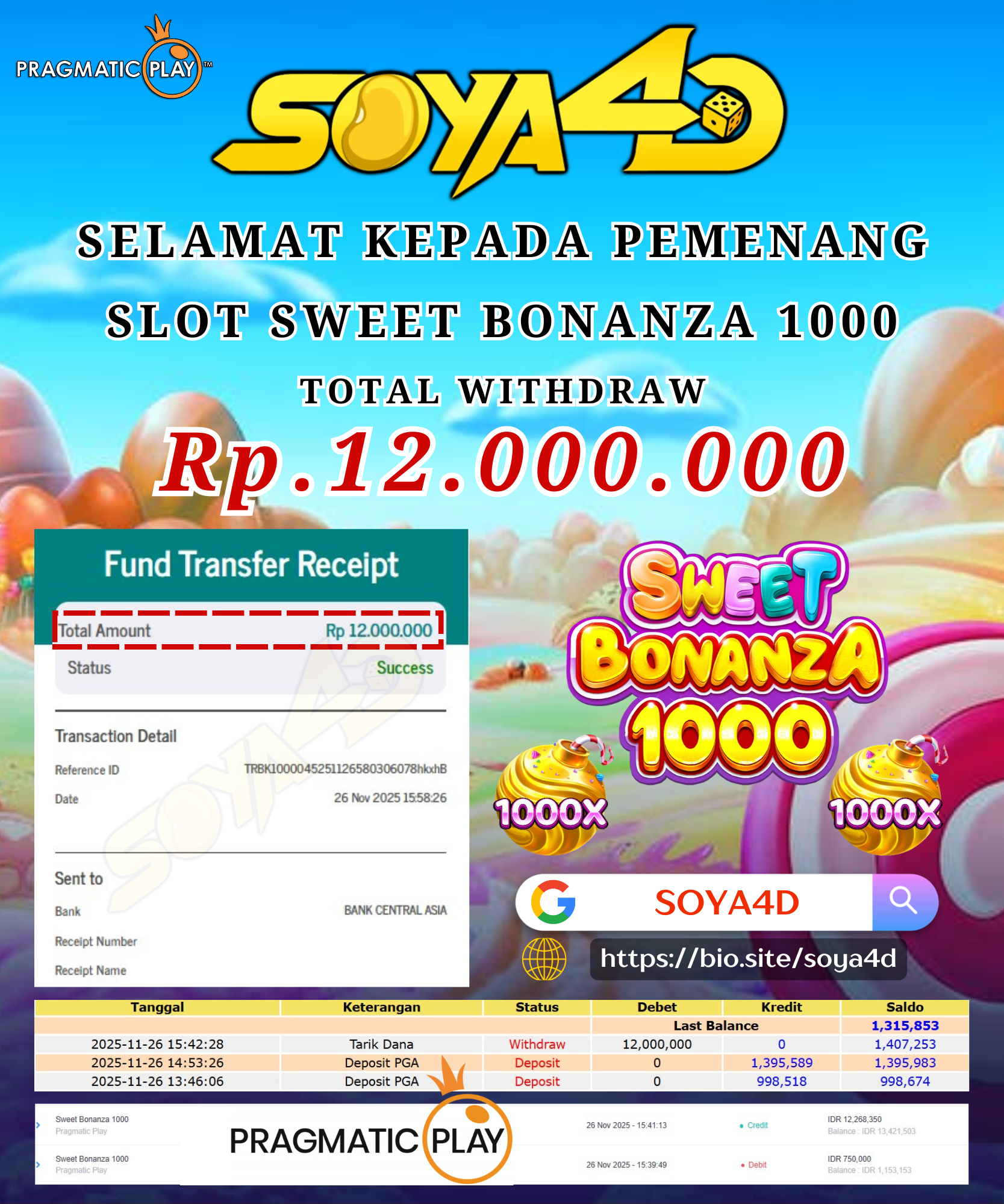 Selamat kepada User id : PE**** Telah berhasil mendapatkan kemenangan besar pada permainan SLOT WILD BANDITO. Dengan kemenangan Sebesar Rp.9.830.000.- Setelah mengisi formulir withdraw dengan kurang waktu hanya 1 – 10 menit pihak SOYA4D sudah melakukan transfer kepada pemilik user id dan dana sudah masuk ke rekening id tersebut oleh pemenang. Bukti pembayaran yang kami berikan merupakan bukti pembayaran yang SAH / VALID yang langsung di dapatkan melalui tanda transfer transaksi berhasil dari Bank yang di tuju.