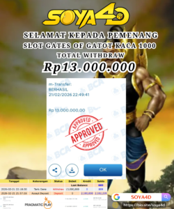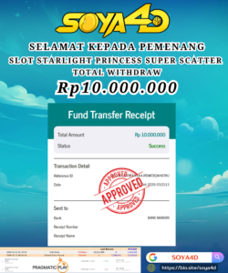 Selamat kepada Userid : MIY***** Telah berhasil mendapatkan kemenangan besar pada permainan SLOT STARLIGHT PRINCESS SUPER SCATTER . Dengan kemenangan Sebesar Rp.10.000.000.-. Setelah mengisi formulir withdraw dengan kurang waktu hanya 1 – 10 menit pihak SOYA4D sudah melakukan transfer kepada pemilik user id. Dan dana sudah masuk ke rekening id tersebut oleh pemenang. Bukti pembayaran yang kami berikan merupakan bukti pembayaran yang SAH / VALID yang langsung di dapatkan melalui tanda transfer transaksi berhasil dari Bank yang di tuju. Kami juga mengucapakan banyak Terima Kasih Kepada pemenang karena sudah mempercayakan kami sebagai Bandar Tepercaya yang membayar semua kemenangan member hingga lunas.